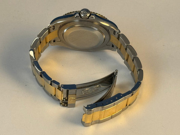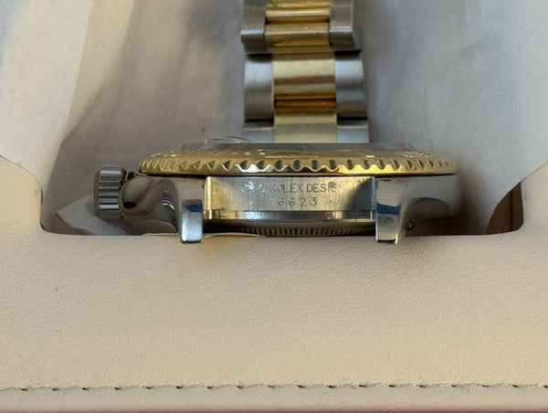 A stunning example of the Rolex Yacht-Master 16623, blending 18kt gold and stainless steel for a timeless and versatile design. With a striking blue sunburst dial and serviced for optimal performance, this watch is a true collector’s piece.