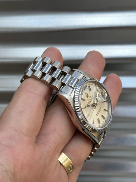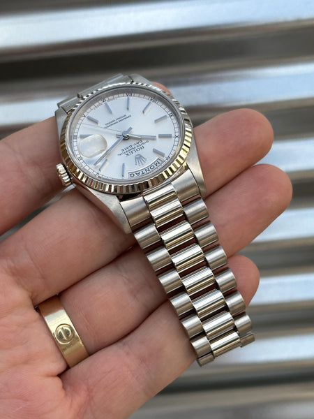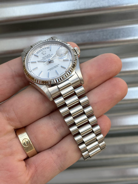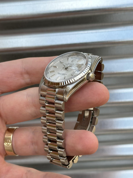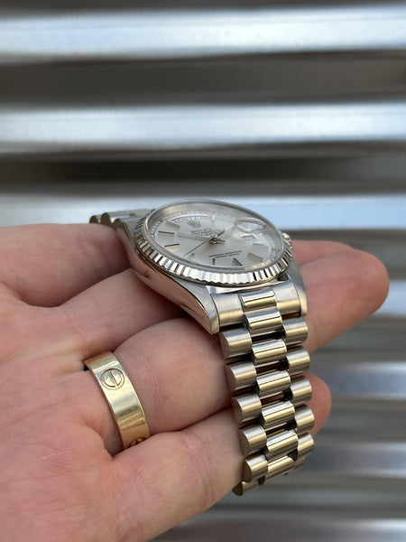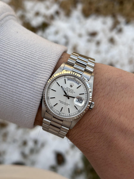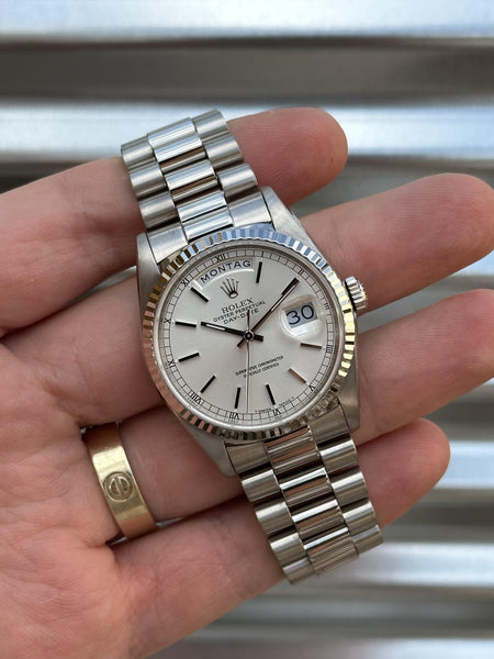 Rolex Day-Date 36 – 18239 – 18k White Gold, Silver Dial, German Day Wheel