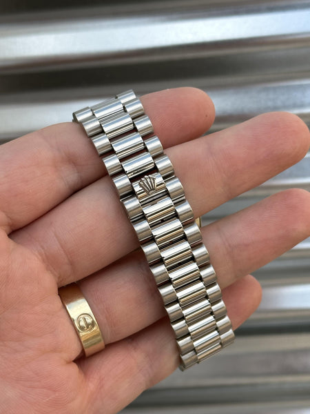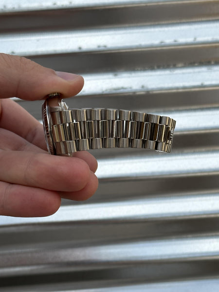 Step into understated luxury with this stealth-wealth Rolex Day-Date 36 in solid 18k white gold. This classic double quickset reference (18239) exudes sophistication with its fluted bezel and iconic presidential bracelet, offering a timeless blend of elegance and functionality.